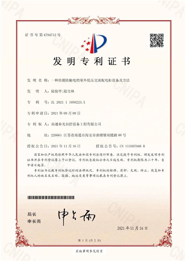 一種防潮防觸電的室外低壓交流配電柜設備及方法發(fā)明專利證書